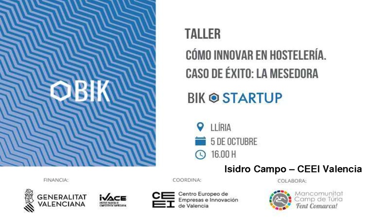 Descargar archivo (.pdf 3.644Kb)Presentación utilizada por Isidro Campo, Técnico de Innovación y Proyectos de CEEI Valencia, en la sesión Cómo innovar en hostelería. Caso de éxito: La Mesedora, realizada el 5 de octubre en Llíria.