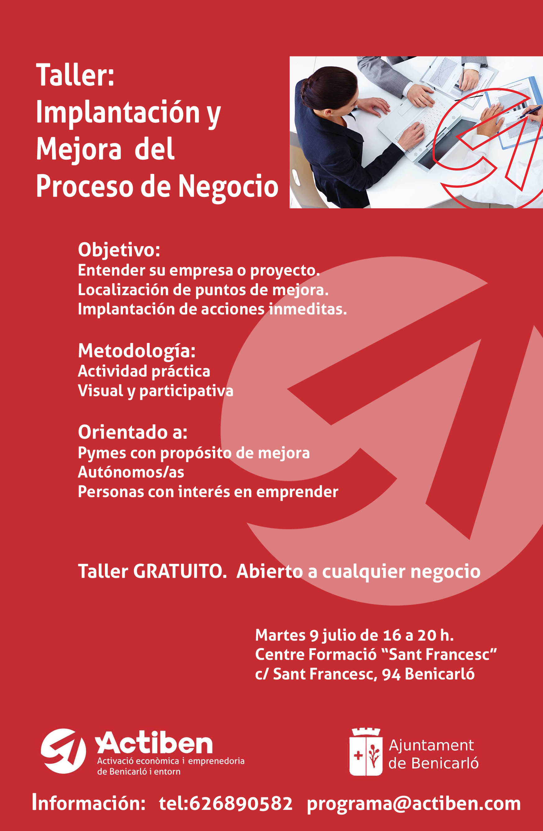 Dentro de los itinerarios formativos del Programa ACTIBEN, el Ayuntamiento de Benicarló ha organizado para el 9 de julio un taller de "Implantación y mejora del proceso de negocio"
