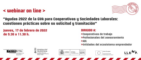 Desde el 31 de enero está abierto el plazo para solicitar las ayudas de 2022 de la Conselleria de Economía Sostenible, destinadas a fomentar la creación, consolidación y competitividad de las cooperativas de la Comunitat Valenciana. Por este motivo, FEVECTA organiza este webinar online a través de Zoom para que las cooperativas de trabajo interesadas y otras entidades prescriptoras puedan conocer en detalle cada una de las actuaciones subvencionables, así como cuáles son los obstáculos más comunes para acceder a ellas y, si es posible, la forma de evitarlos o salvarlos.
