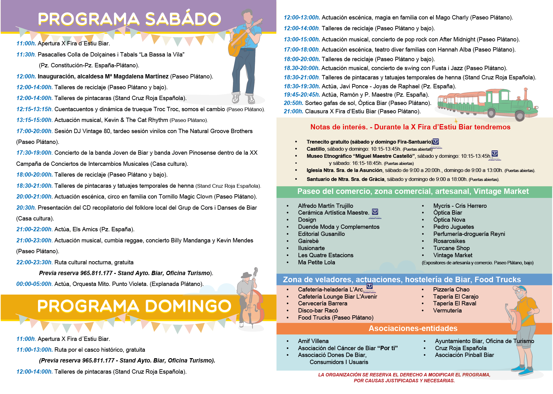 En esta décima edición se cuenta en el programa con dos rutas culturales guiadas, una nocturna y otra diurna. Las dos, gratuitas. Además, se ha organizado unas jornadas de puertas abiertas para las visitas al castillo y museo etnográfico. Una de las peculiaridades de esta feria y que ya se ha convertido en un clásico del evento veraniego es el trenecito, que lleva a los visitantes en un agradable paseo por el municipio, te sugerimos una foto en el corazón Biar, ubicado en el santuario y compartirla en redes.