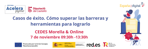 Desde la oficina Acelera Pyme Rural  de la Diputació de Castelló os invitamos a formar parte del Taller Casos de éxito en la digitalización de negocios de mujeres empresarias. Cómo superar las barreras y herramientas para lograrlo que se va a realizar el 7 de noviembre tanto online como en nuestro centro CEDES Morella y va dirigido a mujeres empresarias o con ideas de negocio.