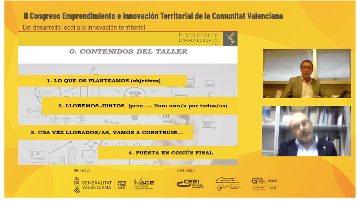 Un total de 50 agentes del ecosistema de emprendimiento detectan 19 soluciones innovadoras tras analizar los retos que el Covid ha planteado en el territorio en el II Congreso de Emprendimiento e Innovación Territorial. Del desarrollo local a la innovación territorial organizado por la Red CEEI Comunitat Valenciana, ADLYPSE CV y GRIDET-UV y financiado por la Generalitat Valenciana a través de IVACE.