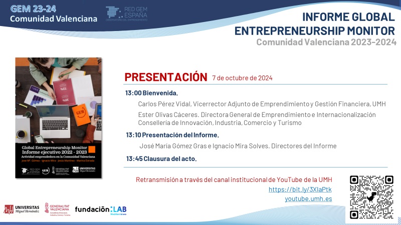El 7 de octubre se presentará el nuevo Informe GEM Comunidad Valenciana 2023-2024, donde se explicará la situación de la actividad emprendedora en la Comunidad Valenciana 2023-2024