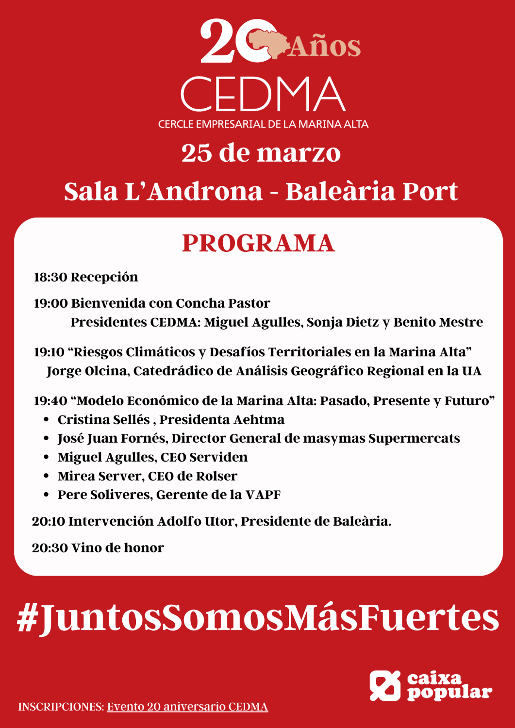 Ahora, dos décadas después, el Cercle Empresarial de la Marina Alta quiere celebrar estos primeros 20 años con un evento que lleva por lema “Juntos Somos Más Fuertes”, un acto que tendrá lugar el próximo 25 de marzo en la Sala L’Androna de Baleària Port, en la Estación Marítima de Dénia.