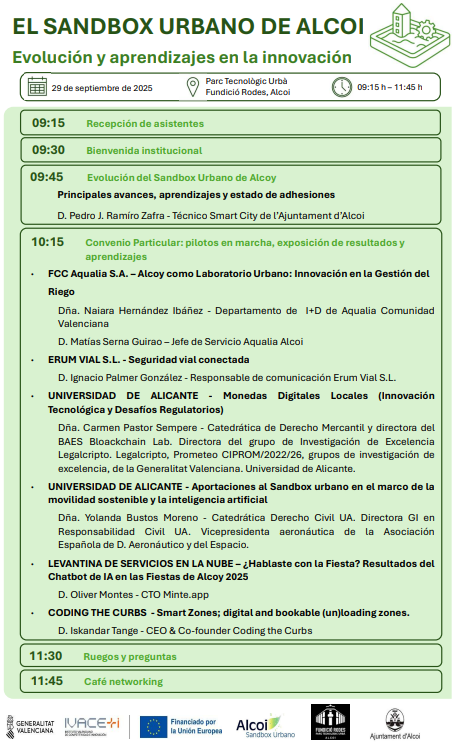Jornada "El Sandbox Urbano de Alcoi: evolución y aprendizajes en la innovación" que se celebrará el próximo 29 de septiembre de 2025 a las 09.15h en el Parc Tecnològic Urbà Fundició Rodes en Alcoy.