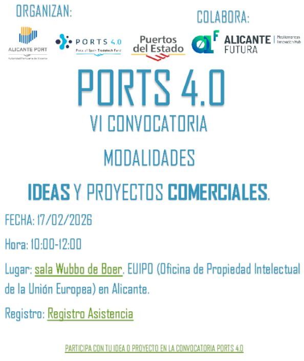 El próximo martes 17 de febrero, la Oficina de Propiedad Intelectual de la Unión Europea (EUIPO) acogerá, en la sala Wubbo de Boer, la Jornada de difusión de la VI Convocatoria de Ports 4.0, organizada por la Autoridad Portuaria de Alicante, un encuentro orientado a impulsar la innovación, la sostenibilidad y la transformación digital en el ámbito portuario.