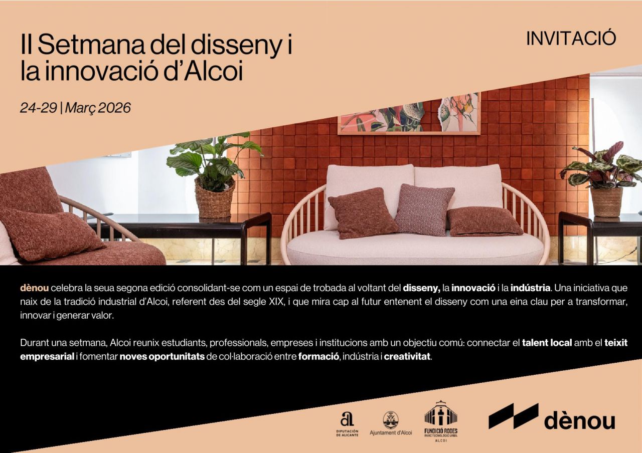 dènou celebra su segunda edición consolidándose como un espacio de encuentro en torno al diseño, la innovación y la industria. Una iniciativa que parte de la tradición industrial de Alcoy, referente desde el siglo XIX, y que mira al futuro entendiendo el diseño como una herramienta clave para transformar, innovar y generar valor.