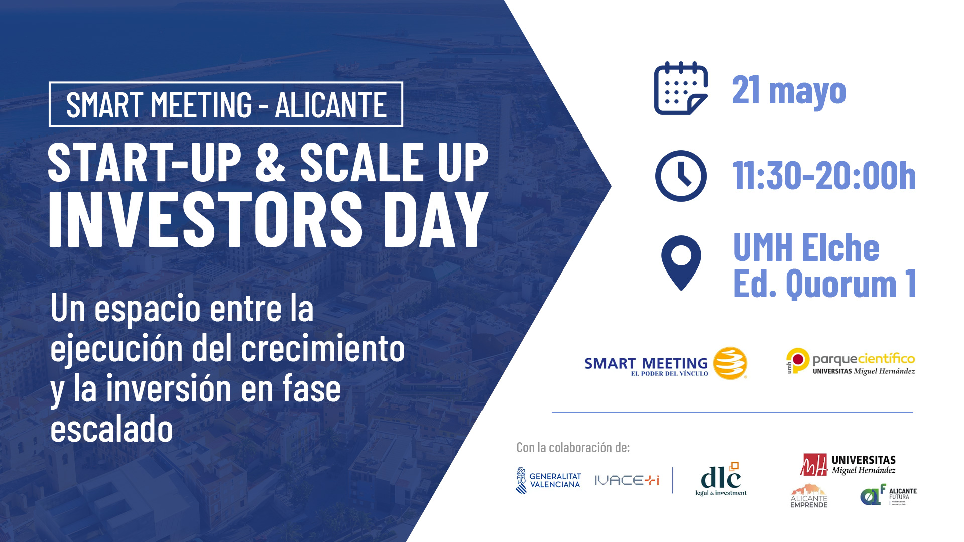 El Scale-up Investors Day – Alicante es un encuentro organizado por Smart Meeting, concebido como un punto de conexión entre empresas en fase de escalado y capital inversor. La jornada reunirá a founders, inversores, corporates, mentores y representantes del ecosistema empresarial para identificar oportunidades reales de colaboración y financiación, con un enfoque práctico, estratégico y orientado a resultados.