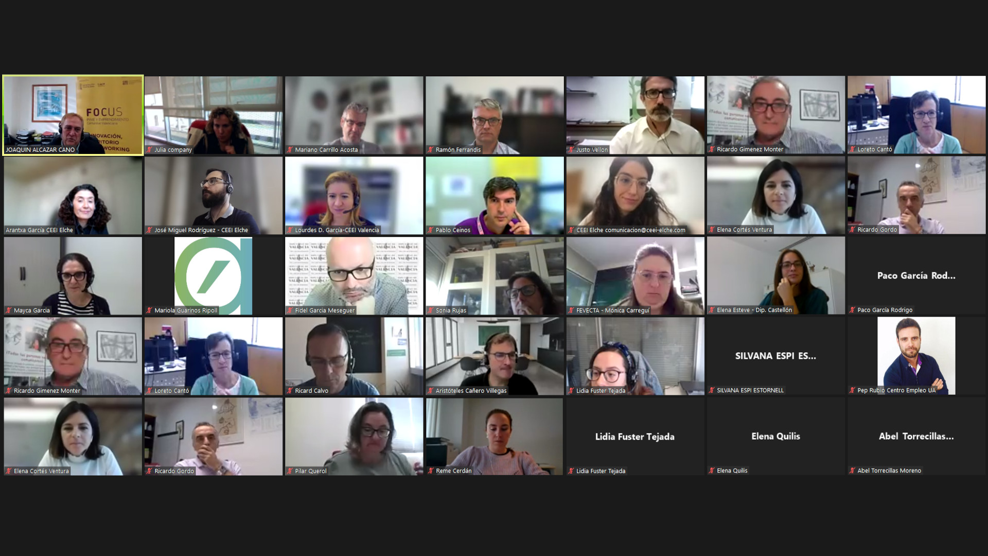 En esta reunión han participado representantes de IVACE, Parque Científico de la UMH, Observatorio Ocupacional UMH, Diputació Provincial de València, Diputación Provincial de Castellón, Turisme GVA, Ajuntament de Castelló, Asociación de Trabajadores Autónomos de la Comunidad Valenciana, ESIC Business&Marketing School, AESAL CV, Agenda AVANT Generalitat Valenciana, GRIDET, Fundación Universitat Jaume I - Empresa, Fundació Nova Feina de la Comunitat Valenciana, REDIT, SECOT Valencia, SECOT Castellón, Consejo de Cámaras de Comercio de la CV, Jovempa Elche, PEAKS Business School, AEPA, Impulsa Alicante, Centro de Empleo de la Universidad de Alicante, AECTA, AVAESEN, Entidad Urbanística de Conservación de Elche Parque Industrial, CEEI Elche, CEEI Castellón y CEEI Valencia.