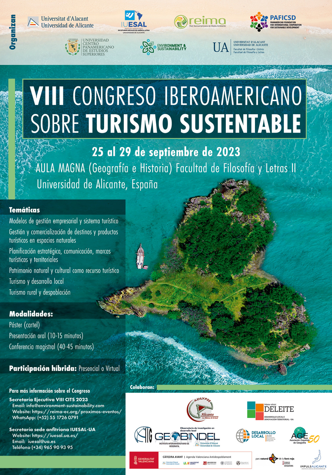 Organizado desde el Instituto Universitario de Estudios Sociales de América Latina-IUESAL, el Máster DELEITE y la Cátedra Interuniversitaria AVANT-GVA de la Universidad de ALICANTE, y la RED IBEROAMERICANA DE MEDIO AMBIENTE (REIMA), junto con la colaboración de otras instancias e instituciones internacionales, nacionales y provinciales, como ADLYPSE-ALICANTE, se presenta el VIII Congreso Iberoamericano de TURISMO SUSTENTABLE del 25 al 29 de septiembre en formato híbrido, y con presencialidad síncrona. Se desarrollará en el Aula Magna de la Facultad de Filosofía y Letras y comenzará el lunes 25 a las 16’00 horas. El resto de sesiones presenciales (síncronas) se llevarán a cabo de 12’00 hasta 21’00 horas el martes y el viernes. El miércoles y el jueves, se realizarán sendas salidas de campo, para visitar dos espacios naturales emblemáticos de nuestra provincia, el parque natural de La Font Roja-Serra Mariòla, y la reserva marítimo terrestre de la Isla de Tabarca, respectivamente. Además, hay seis líneas de trabajo, donde se pueden presentar comunicaciones, destacando principalmente para nuestro colectivo las de Turismo y Desarrollo Local, y la de Turismo rural y despoblación, que se desarrollarán en la sesión del viernes 29. A mediados de abril se podrá encontrar más información detallada en las siguientes páginas web: