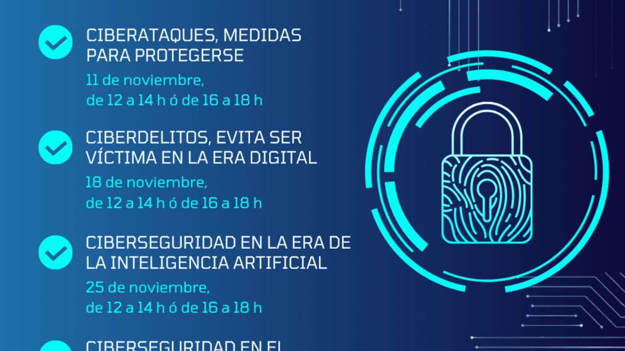 El 12 de noviembre, el taller será sobre ‘Ciberdelitos, evita ser víctima en la era digital’, también pudiendo elegir horario de mañana o tarde.  La siguiente propuesta está prevista para el 25 de noviembre, en este caso se hablará de ‘Ciberseguridad en la era de la Inteligencia Artificial’, uno de los temas más candentes y de plena actualidad sobre los que hay mucho que aprender.